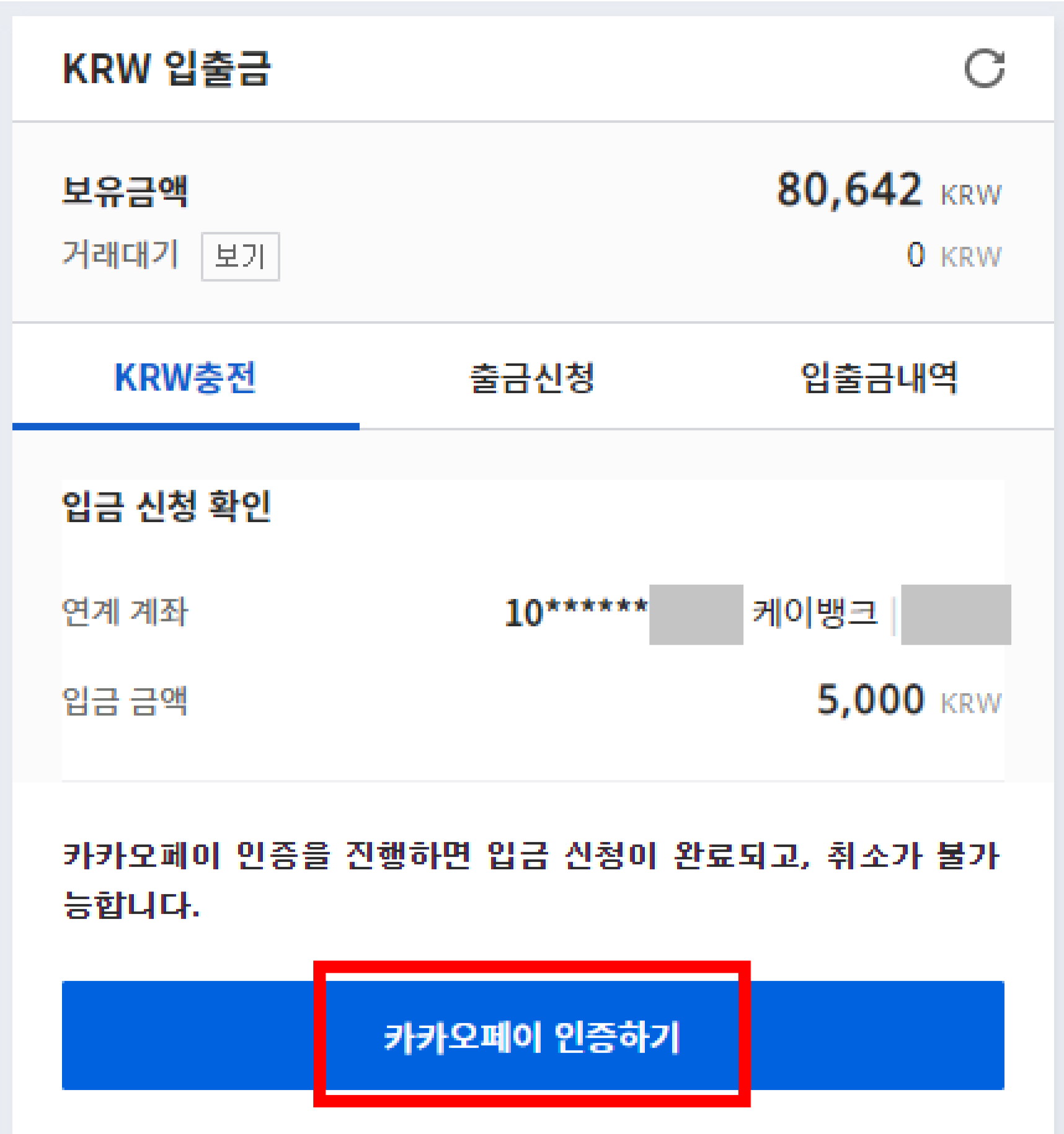 3) 입금 신청을 확인하고 ■카카오페이 인증하기 버튼을 클릭합니다.