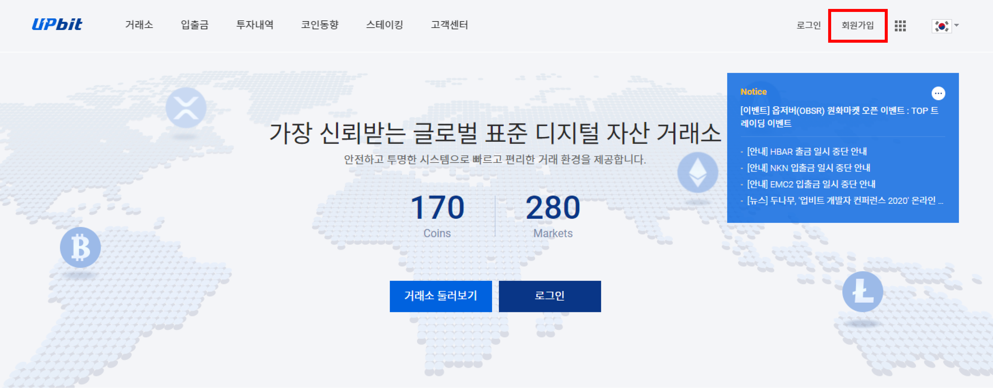 1) 업비트에 들어가서 우측 상단 ■회원가입을 클릭합니다.
