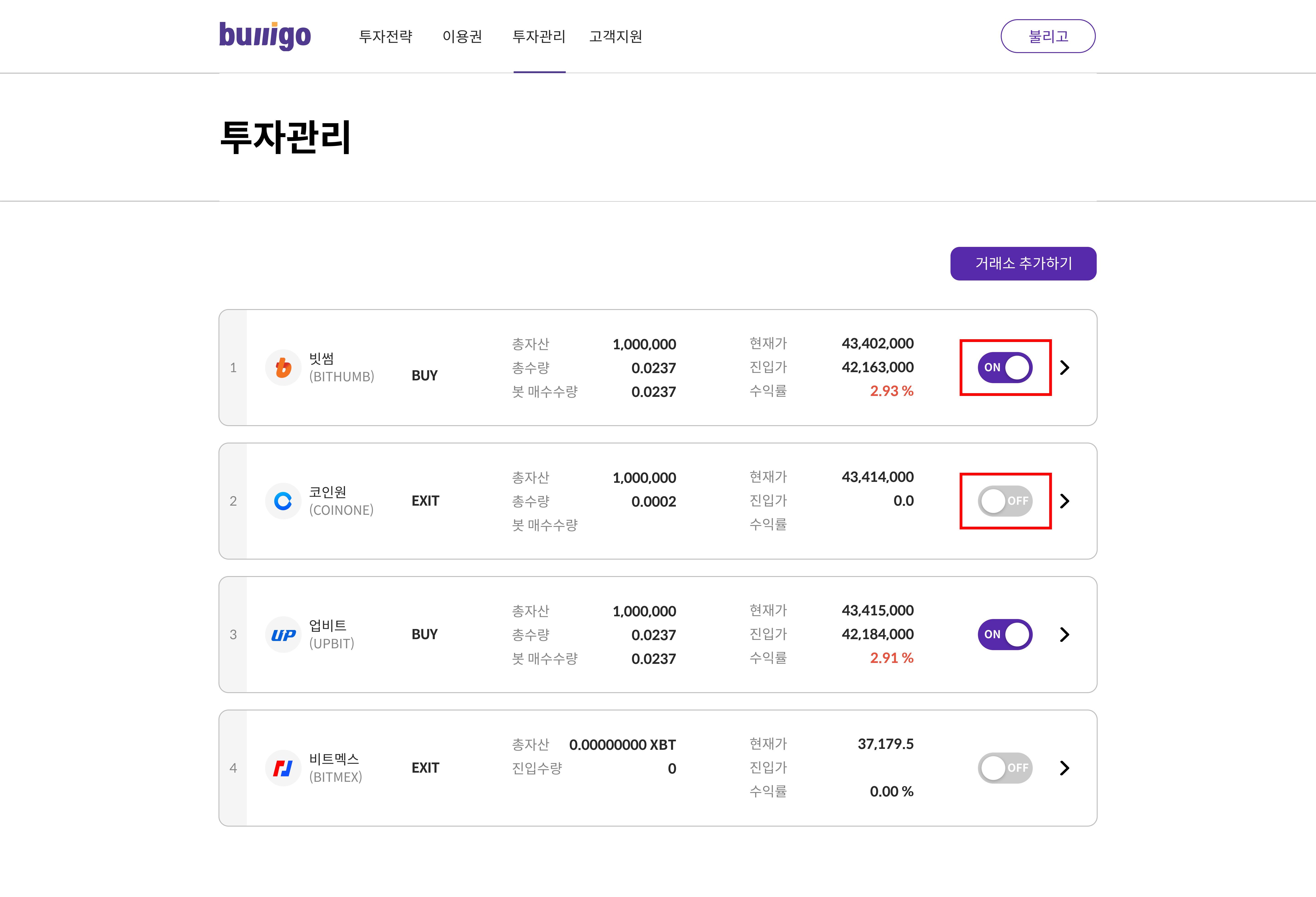 불리고 회원가입을 하고 봇 생성 후 OFF > ON으로 변경해야 자동매매가 시작됩니다.