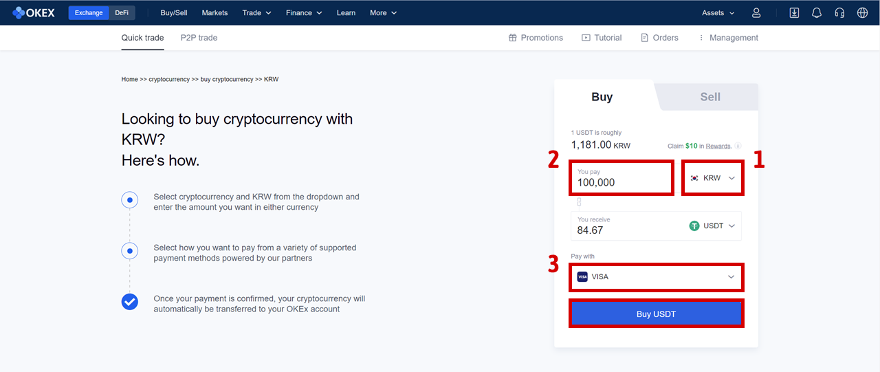 - 2번 ■Buy crypto: 이용하는 타 거래소가 없을 경우, 현지 통화로 구매하여 가상자산 투자를 하실 수 있습니다.