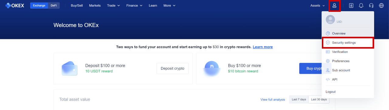 1. 로그인 후 홈페이지 우측 상단에 있는 ■사람 모양의 아이콘에서 ■Security settings를 클릭합니다.