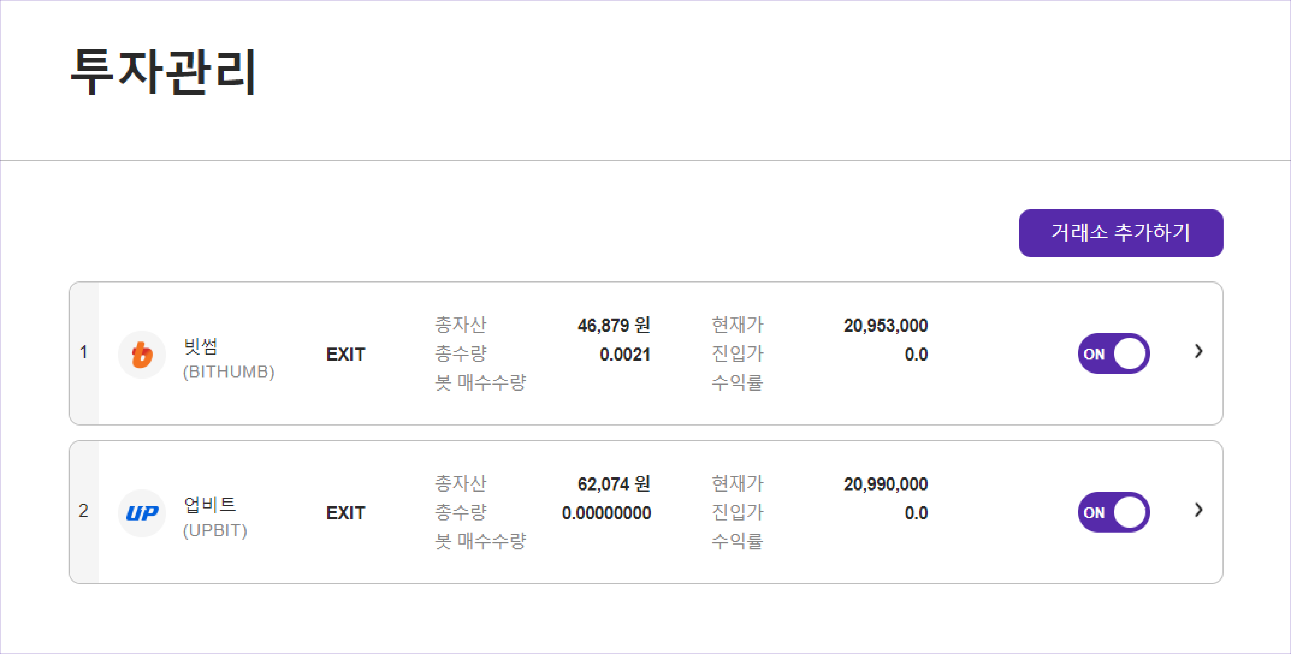 투자관리 메뉴에서 거래소를 추가하여 자동거래를 시작해 보겠습니다!