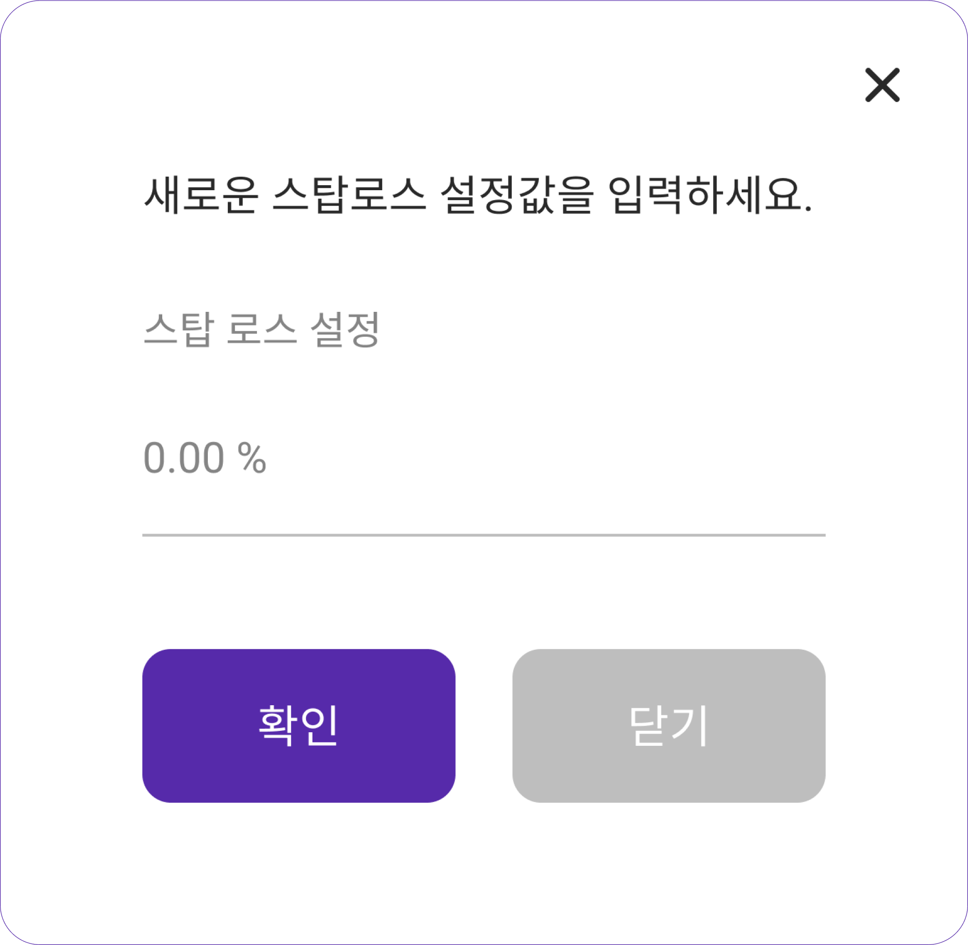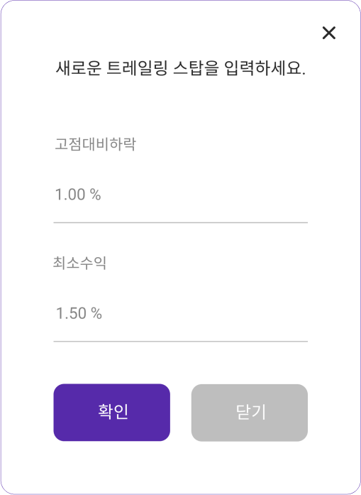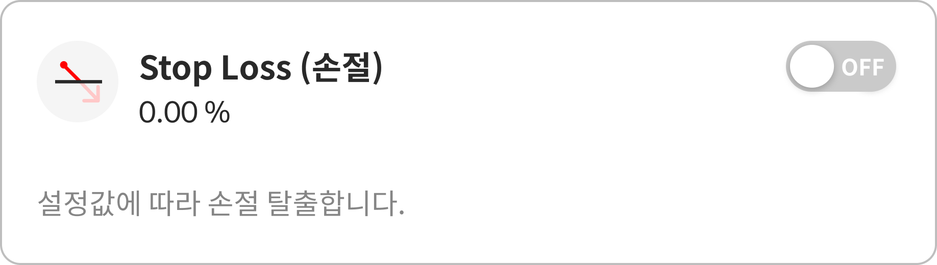 자동 매매 신호에 따라 매수(진입) 한 뒤 급 하락 시 더 큰 손실을 줄이기 위해 설정 비율만큼 손해를 보고 탈출할 수 있습니다. 기본 설정은 OFF로 되어 있습니다.
