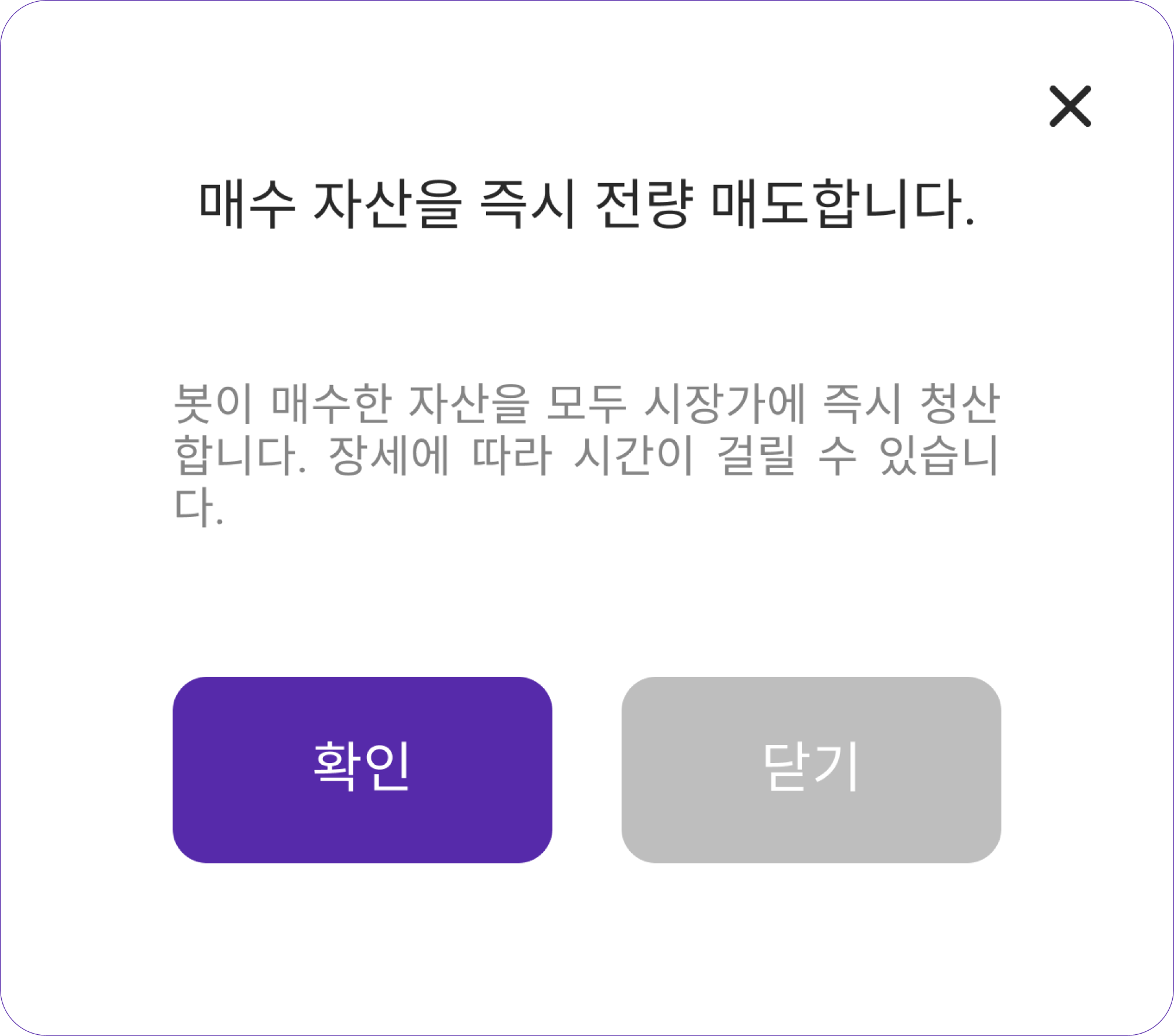자동 매매 신호에 따라 매수(진입)한 수량을 모두 시장가로 매도(청산) 합니다. 긴급하게 원화를 출금할 때, 포지션 정리 용도로 활용됩니다.