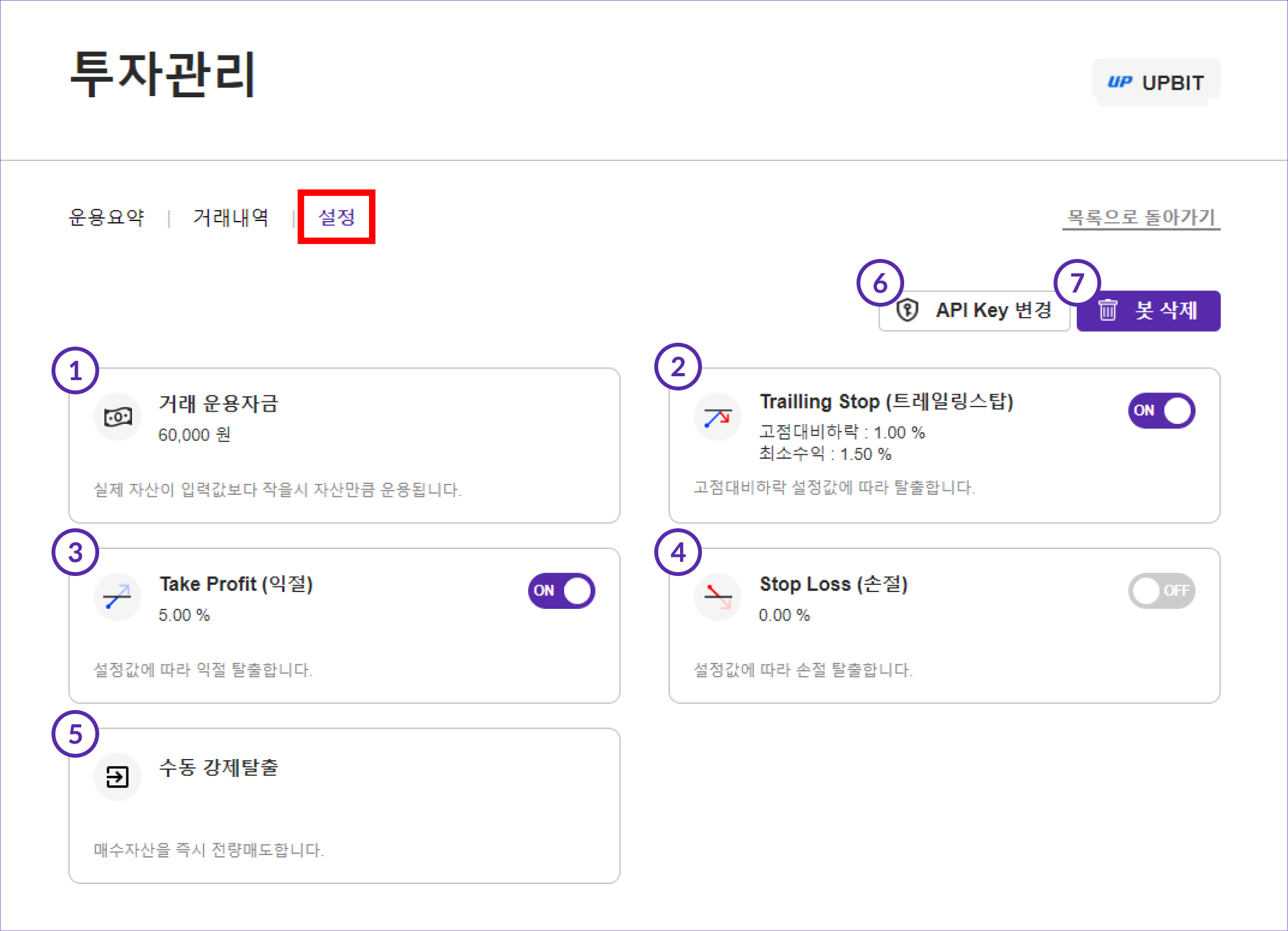 * 봇 생성 시 기본 설정은 Trailling Stop 1.0%, 최소수익 1.5%, Take Profit(익절) 5%, Stop Loss(손절) 0% (off)입니다.
