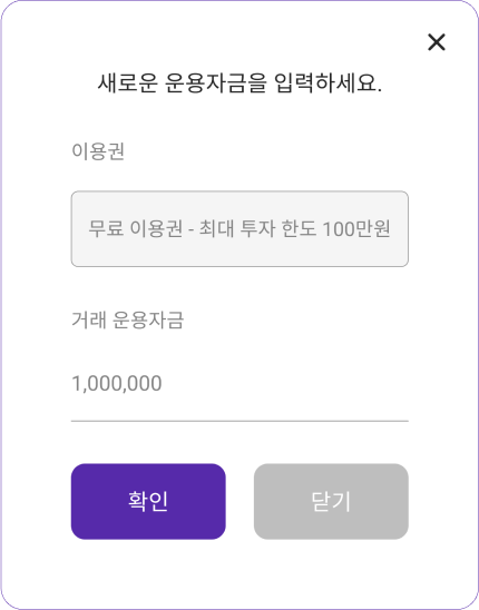 거래소 추가하기로 봇 생성 시 입력했던 거래 운용자금을 확인, 변경할 수 있습니다. 만약 실제 자산이 입력값보다 작을 시 현재 내가 가진 자산만큼만 운용됩니다.