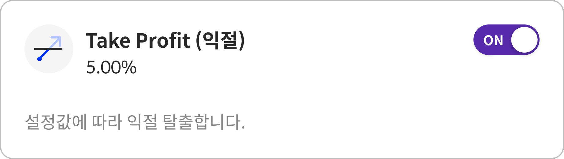 자동 매매 신호에 따라 매수(진입) 한 뒤 매도 신호전에 설정 비율만큼 이익을 보고 탈출할 수 있습니다. 기본 설정은 5%로 되어 있으며, 언제든지 변경 가능합니다.