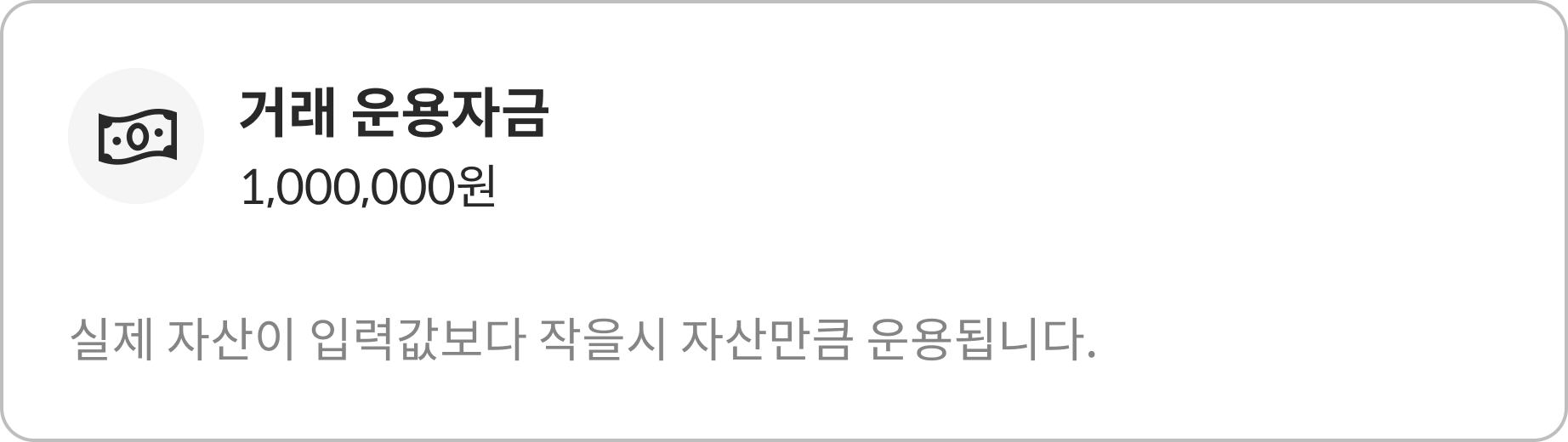 거래소 추가하기로 봇 생성 시 입력했던 거래 운용자금을 확인, 변경할 수 있습니다. 만약 실제 자산이 입력값보다 작을 시 현재 내가 가진 자산만큼만 운용됩니다.