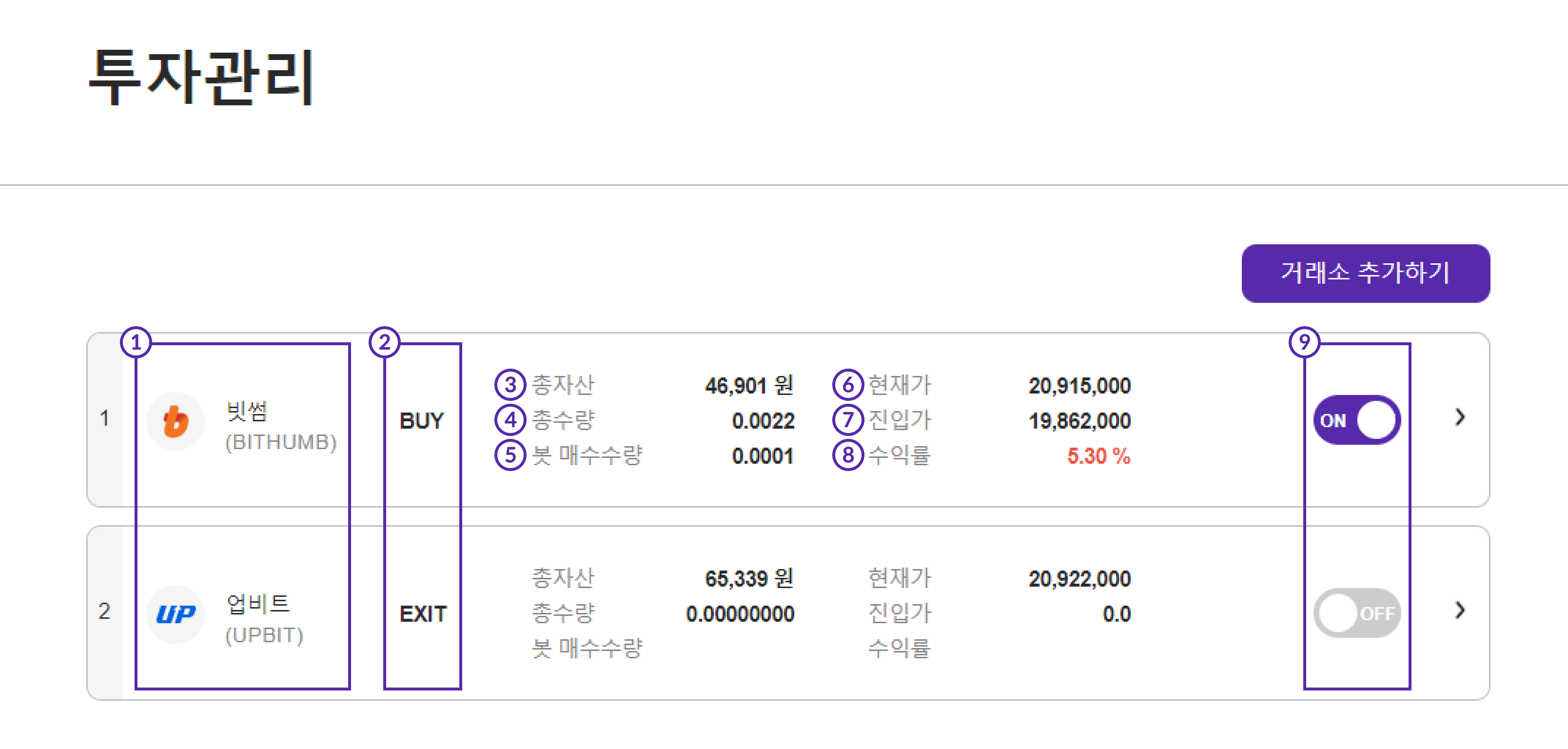 거래소 선택 시 보이는 운용 요약 화면입니다.