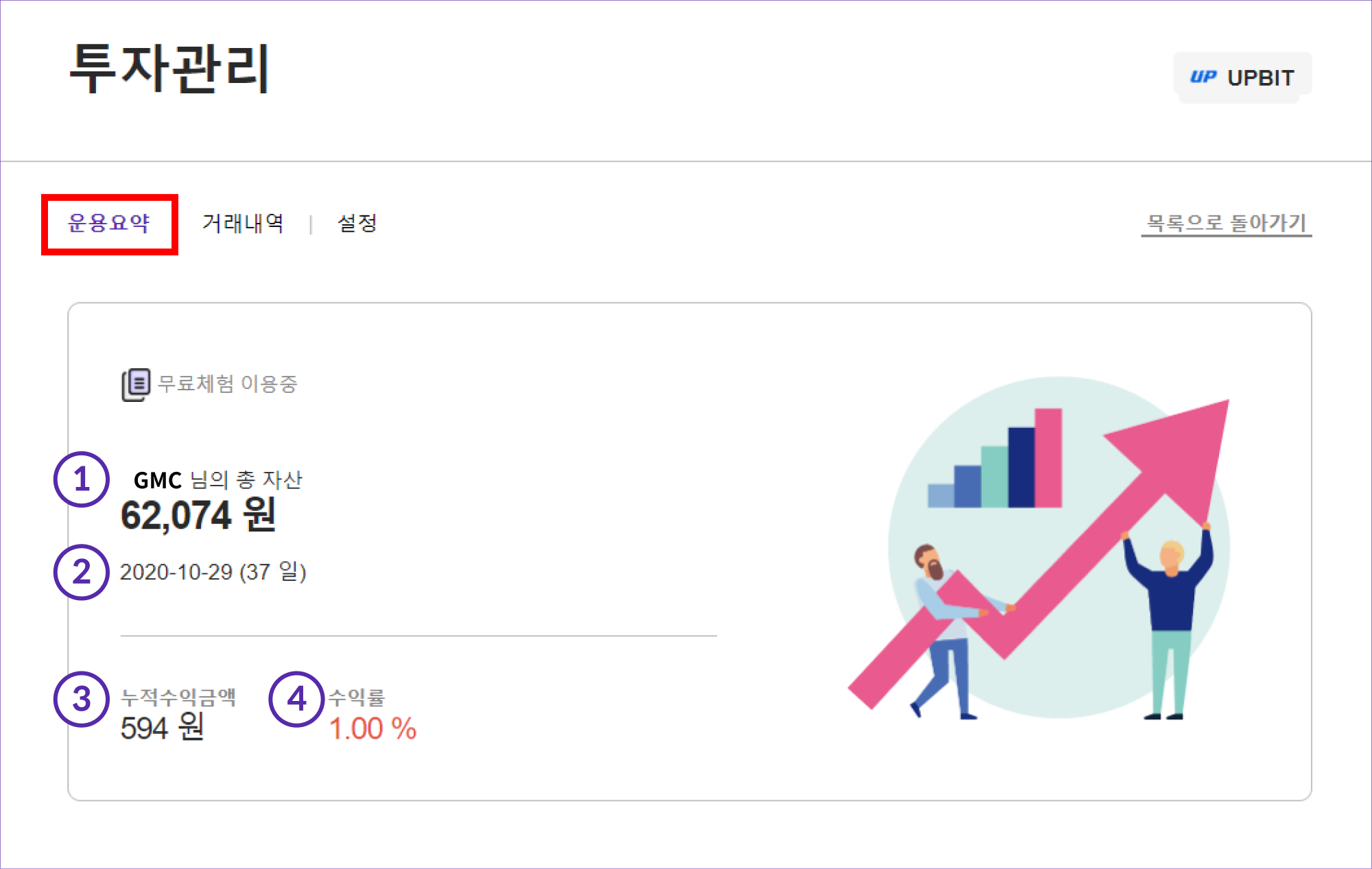 ① 총 자산 : 현재 내가 보유하고 있는 원화와 비트코인(KRW 환산)을 합산한 총 자산을 알려줍니다.