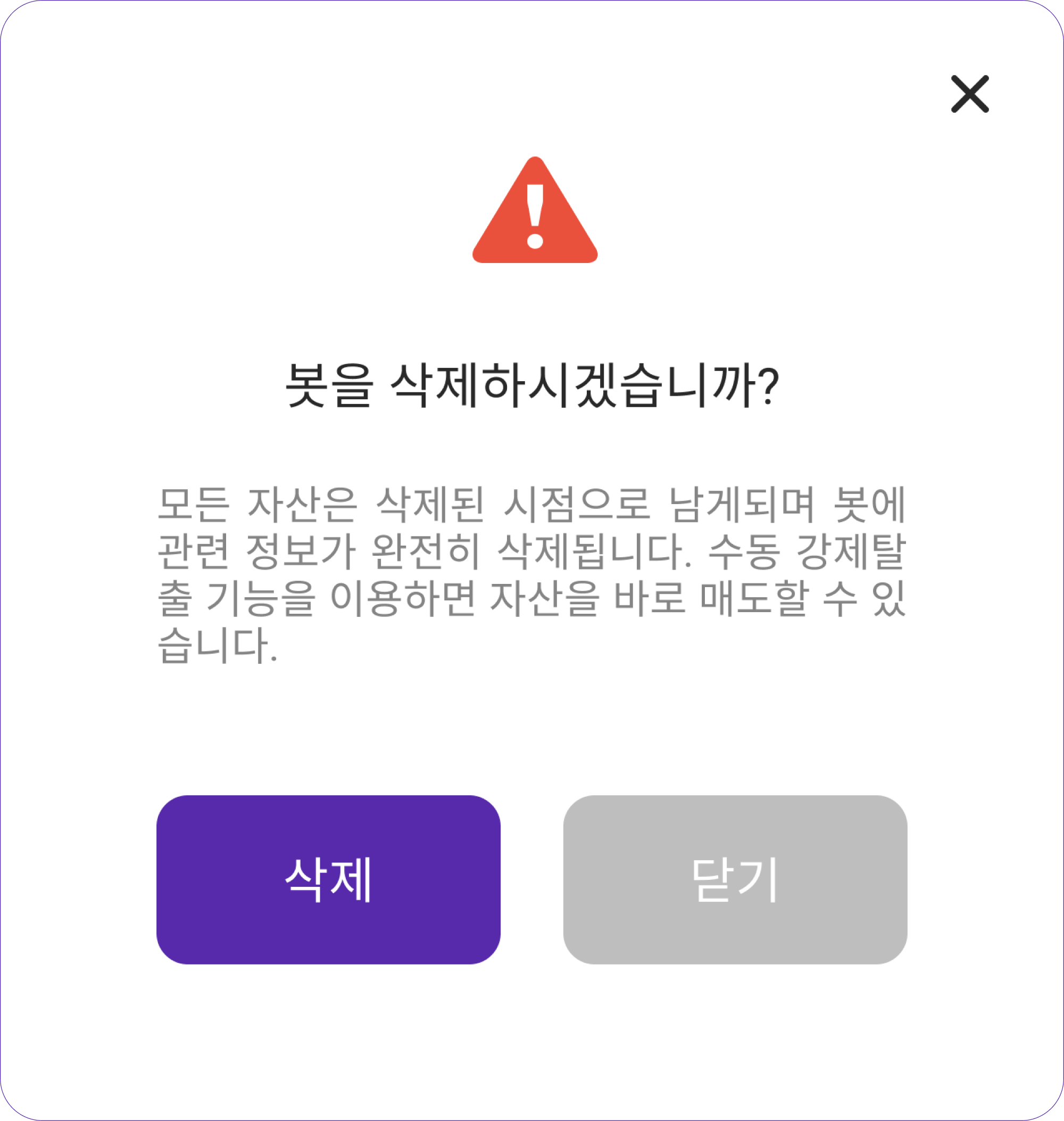 봇을 삭제 시 거래내역 및 봇에 관련한 정보들은 완전히 삭제됩니다.