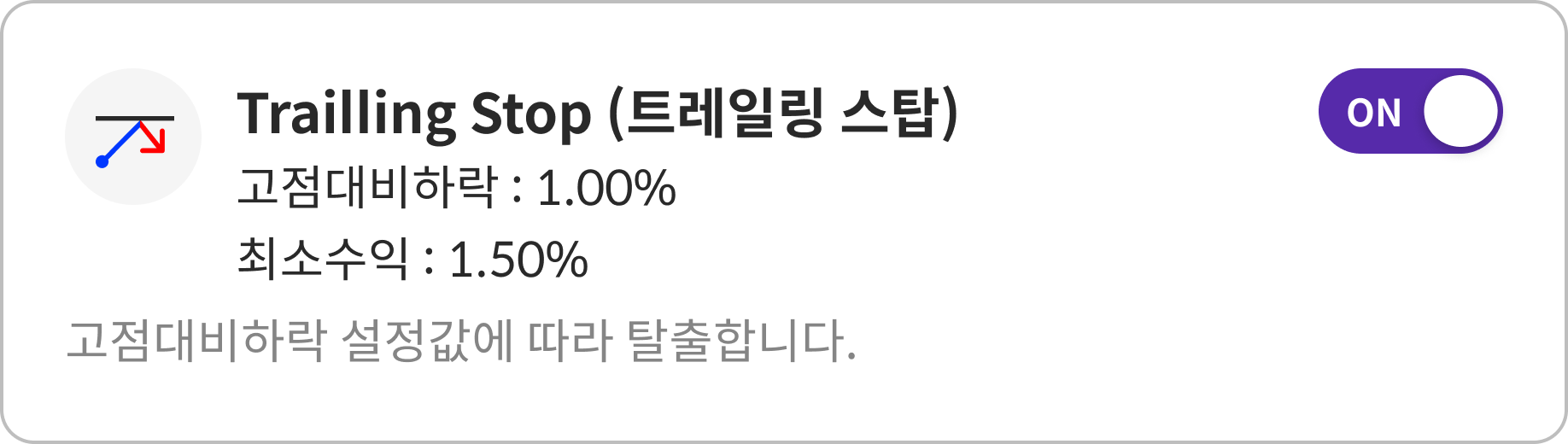 트레일링스탑에는 설정이 "고점 대비 하락" 과 "최소수익" 2가지가 있습니다. 이 2가지 조건이 달성되면 탈출합니다. “고점 대비 하락”은 고점에서 설정 비율까지 내려가면 탈출함을 의미하고, “최소수익”은 최소한의 수익을 보장함을 의미합니다. 매수(진입) 후 고점 대비 하락이 최소수익보다 클 경우 탈출합니다. 기본 설정은 [고점 대비 하락: 1%, 최소수익: 1.5%]로 되어 있으며, 언제든지 변경 가능합니다. 탈출하더라도 최소 수익은 보장하는 설정입니다.