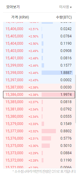 - 현재가 대비 퍼센트와 해당가에 매물의 수량 등을 알 수 있고 매수와 매도를 할 수 있습니다.