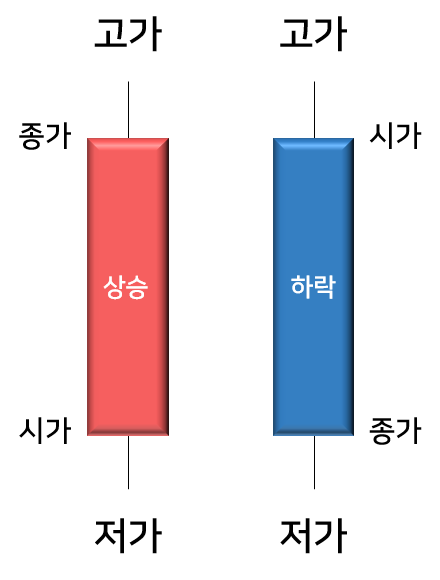 즉, 상승 봉인 양봉은 시가보다 종가가 높을 때, 하락 봉인 음봉은 종가가 시가보다 낮을 때의 표시상태입니다.