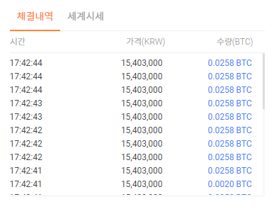 - 거래 시 자주 보는 창으로 현재가와 체결가를 볼 수 있으며 동시에 세력의 개입이나 빠짐, 봇의 활동을 알 수 있습니다.