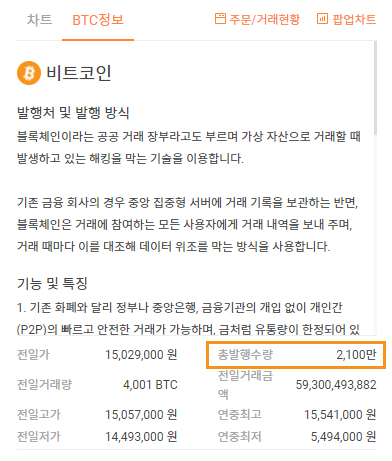 - 코인의 정보를 알 수 있으며 여기서 제일 중요한 항목은 총 발행 수량입니다.