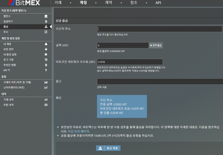 - 금액 : 출금할 금액(수수료는 최소 0.0002, 빠른 출금 시 0.001btc 권장, 한국시간으로 10시에 일괄 출금)