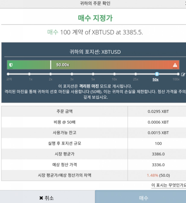 3. 주문 확인창이 뜹니다. 드래그로 레버리지를 조정하고 매수 혹은 매도 버튼을 클릭하면 계약이 성립됩니다.