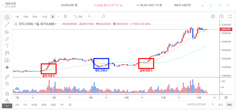 위의 사진을 보시게 되면 정말로 골든크로스 이후 비트코인 가격이 상승했으며, 데드크로스 이후 비트코인 가격이 하락했음을 확인해볼 수 있습니다.