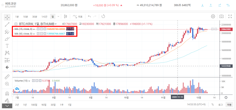 *빗썸에서는 15일 단기선(노란색), 60일 장기선(파란색)이 기본적으로 설정되어 있습니다.