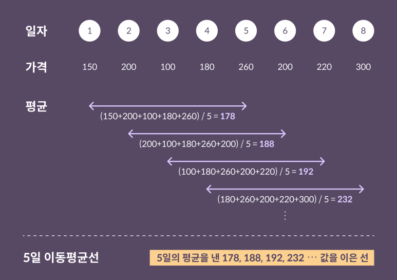이동평균선은 해당 시점에서 시장의 전반적인 주가 흐름을 판단하고, 향후 주가 추이를 전망하는 데 사용되는 대표적인 기술 지표로 활용됩니다.