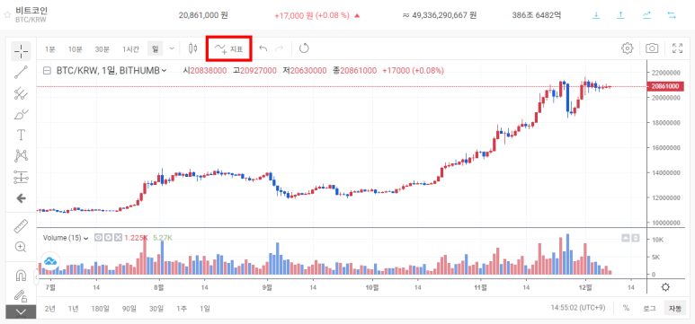 1. 코인 차트에 있는 ■지표를 클릭한다.