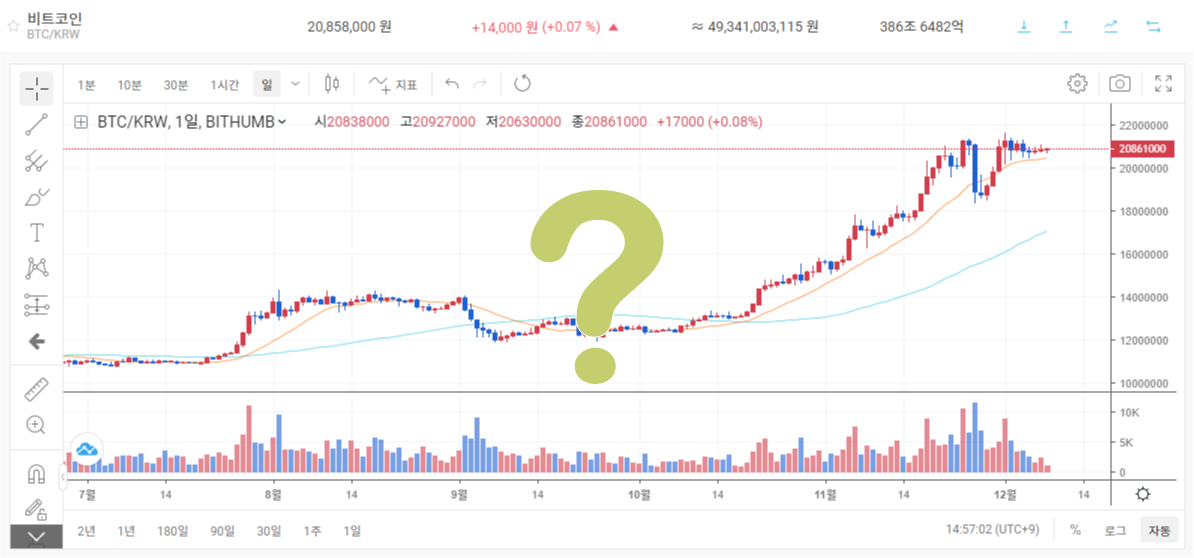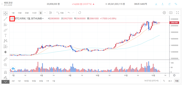 빗썸 거래소의 비트코인 차트를 기준으로 살펴보도록 하겠습니다.
