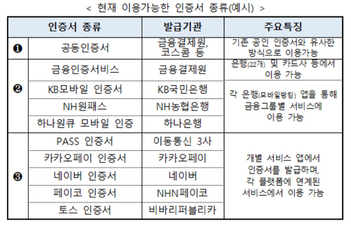 기존에는 정부에서 선정한 6개의 공인인증기관(KISA, 금융결제원 등)에서 발급하는 공인인증서만 신원 확인 도구로 허용되었지만, 이제는 다른 민간 사업자가 발급하는 인증서도 공인인증서와 동일한 법적 효력이 부여됩니다. 즉, 공공기관이나 은행에서 거래할 때 네이버인증·카카오페이·패스·NHN페이코 등에서 발급한 민간인증서를 사용할 수 있습니다.