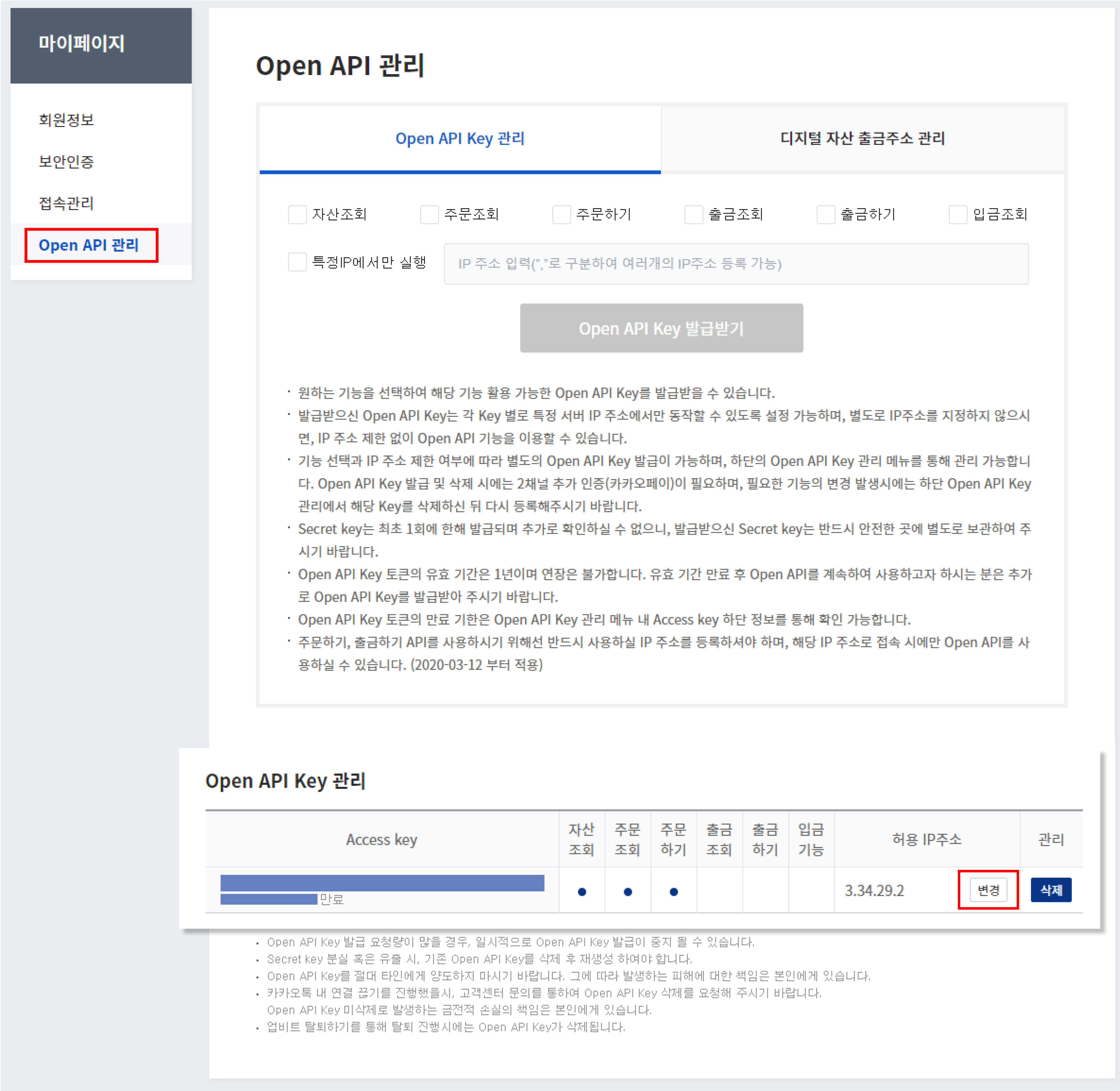 2) 마이페이지 - 'Open API 관리'를 클릭해서 하단의 'Open API Key 관리'에서 ■변경을 클릭합니다.
