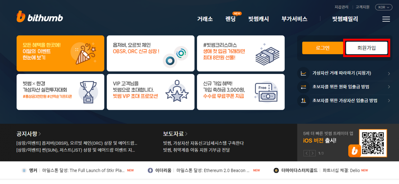 1) 빗썸에 들어가서 우측 상단 ■회원가입을 클릭합니다.