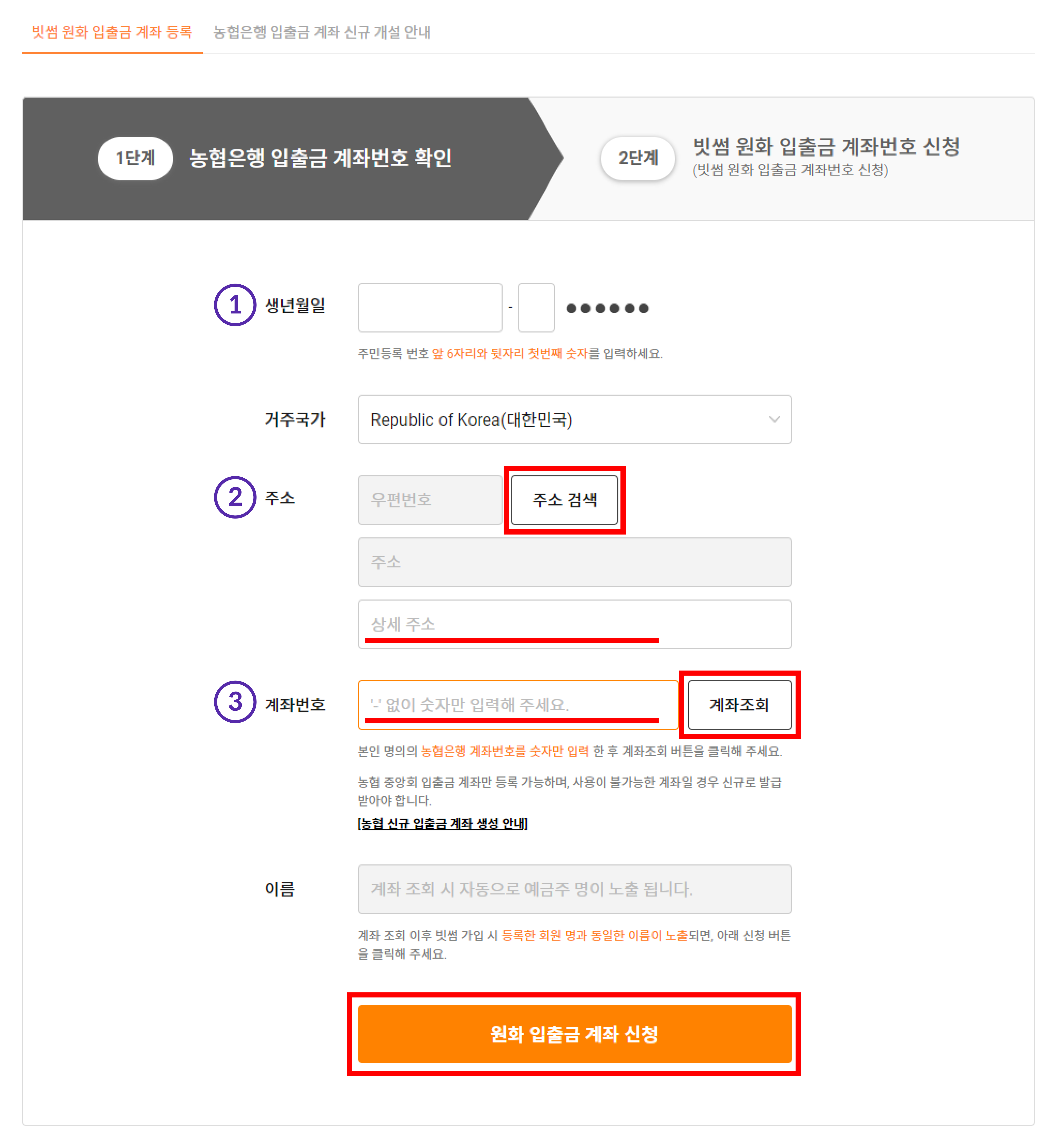 농협 계좌가 아직 없는 분들이나, 단위(지역) 농협 계좌를 가지고 계시는 분들께서는 농협 계좌를 발급받은 다음, 회원가입을 진행해주시기 바랍니다.