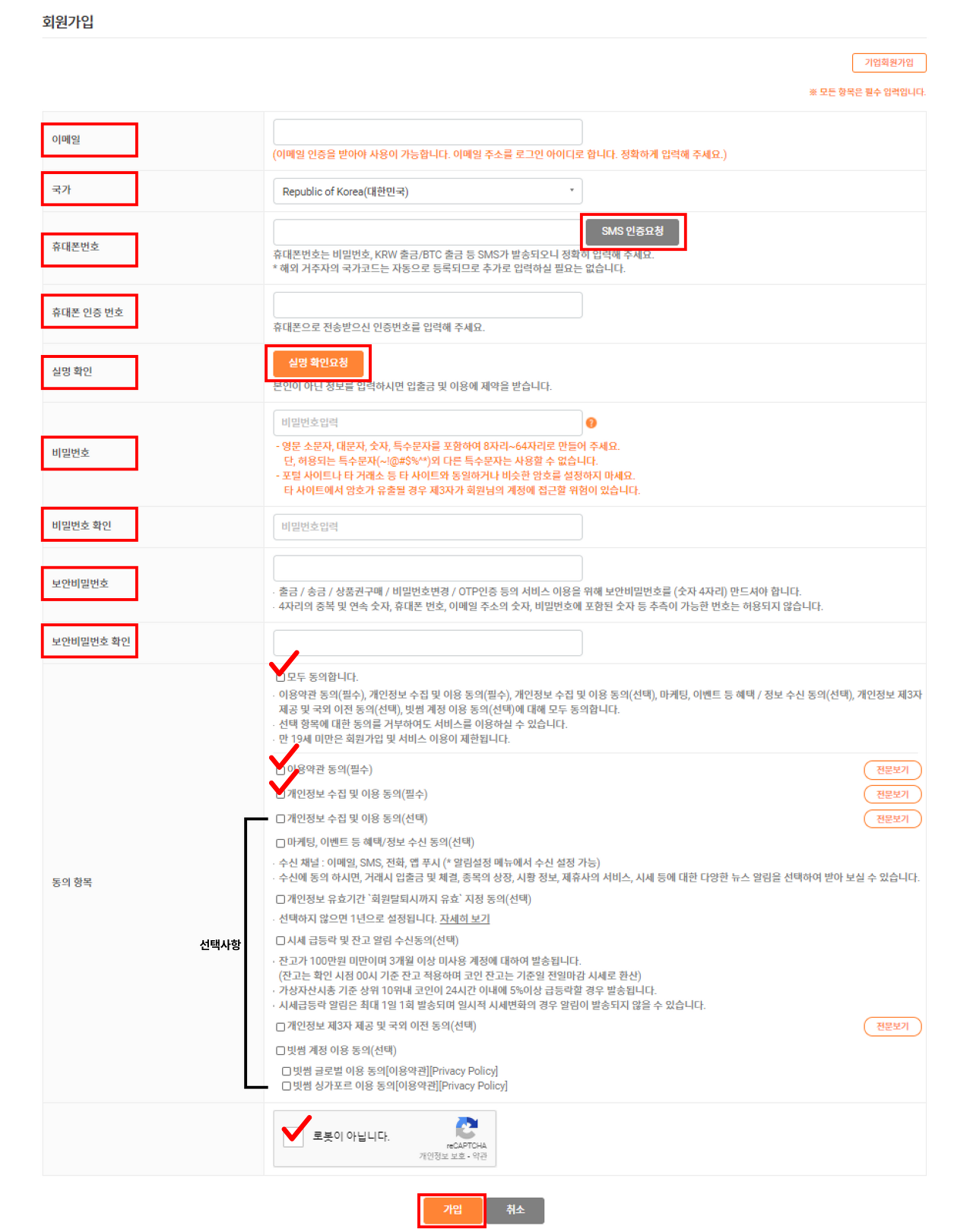 빗썸 회원가입 시 필요한 정보는 다음과 같습니다.