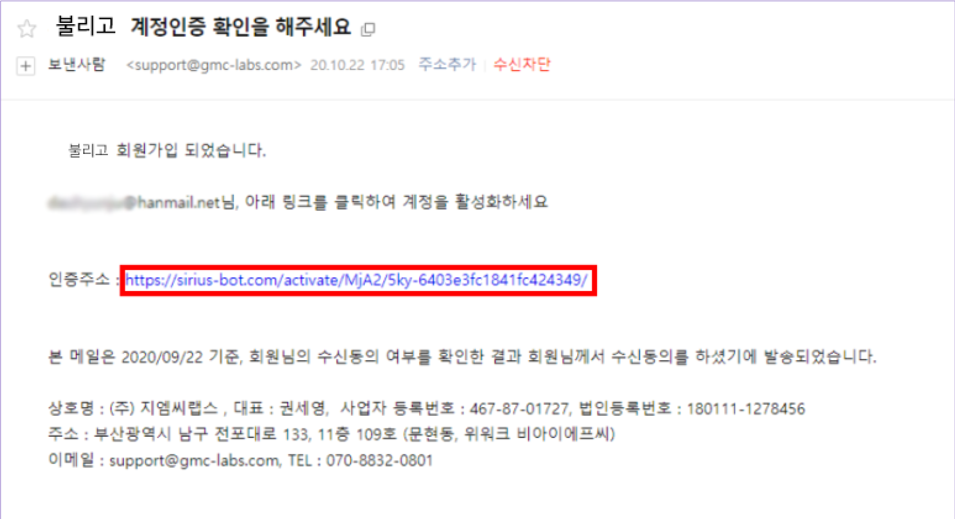 2. 받은 메일함에서 인증 메일을 확인 후 ■인증주소 URL 을 클릭하면 가입이 완료됩니다!