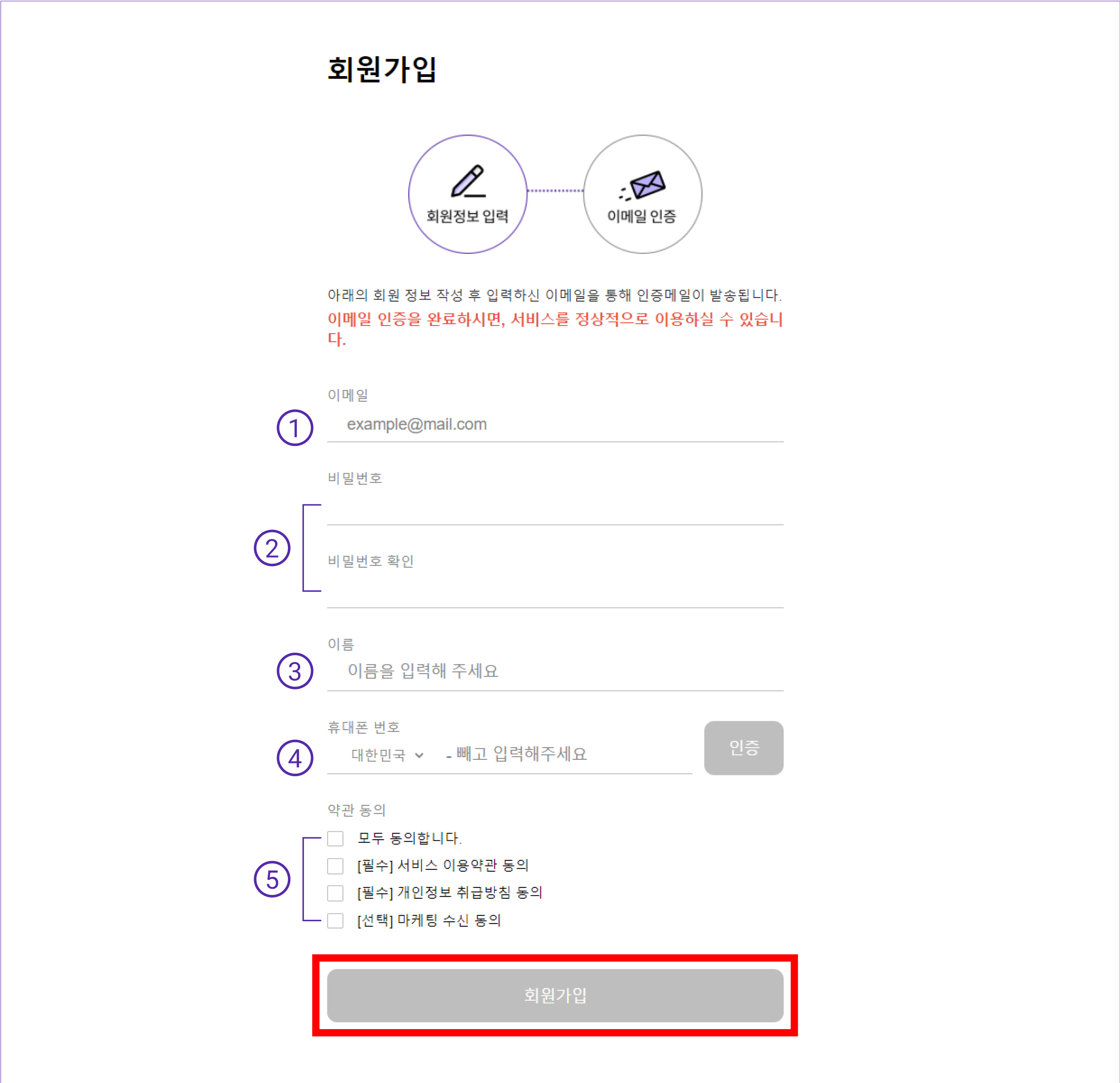 2단계 - 약관 동의 및 회원가입 정보 입력하기