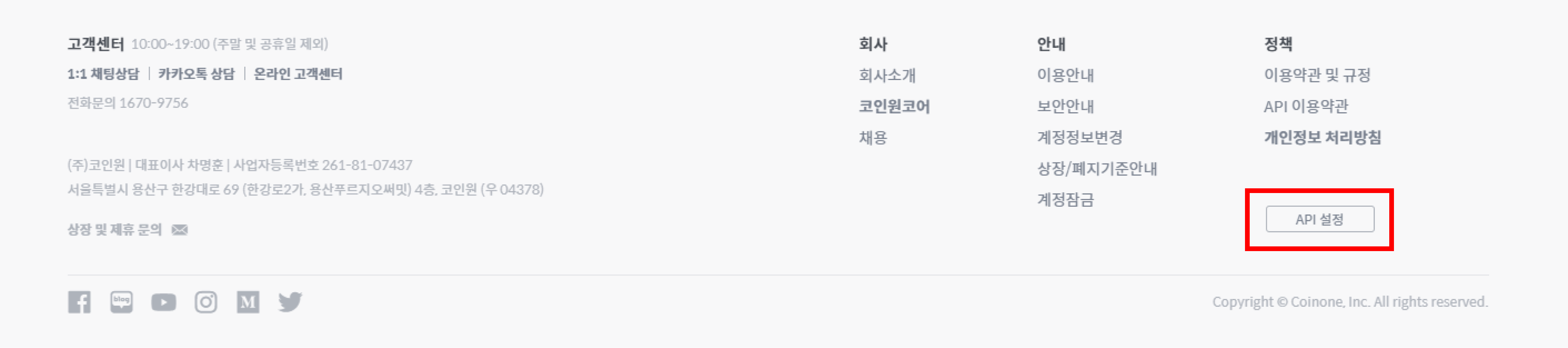1. 로그인 후, 홈페이지 하단 우측에 있는 ■'API 설정' 버튼을 클릭합니다.
