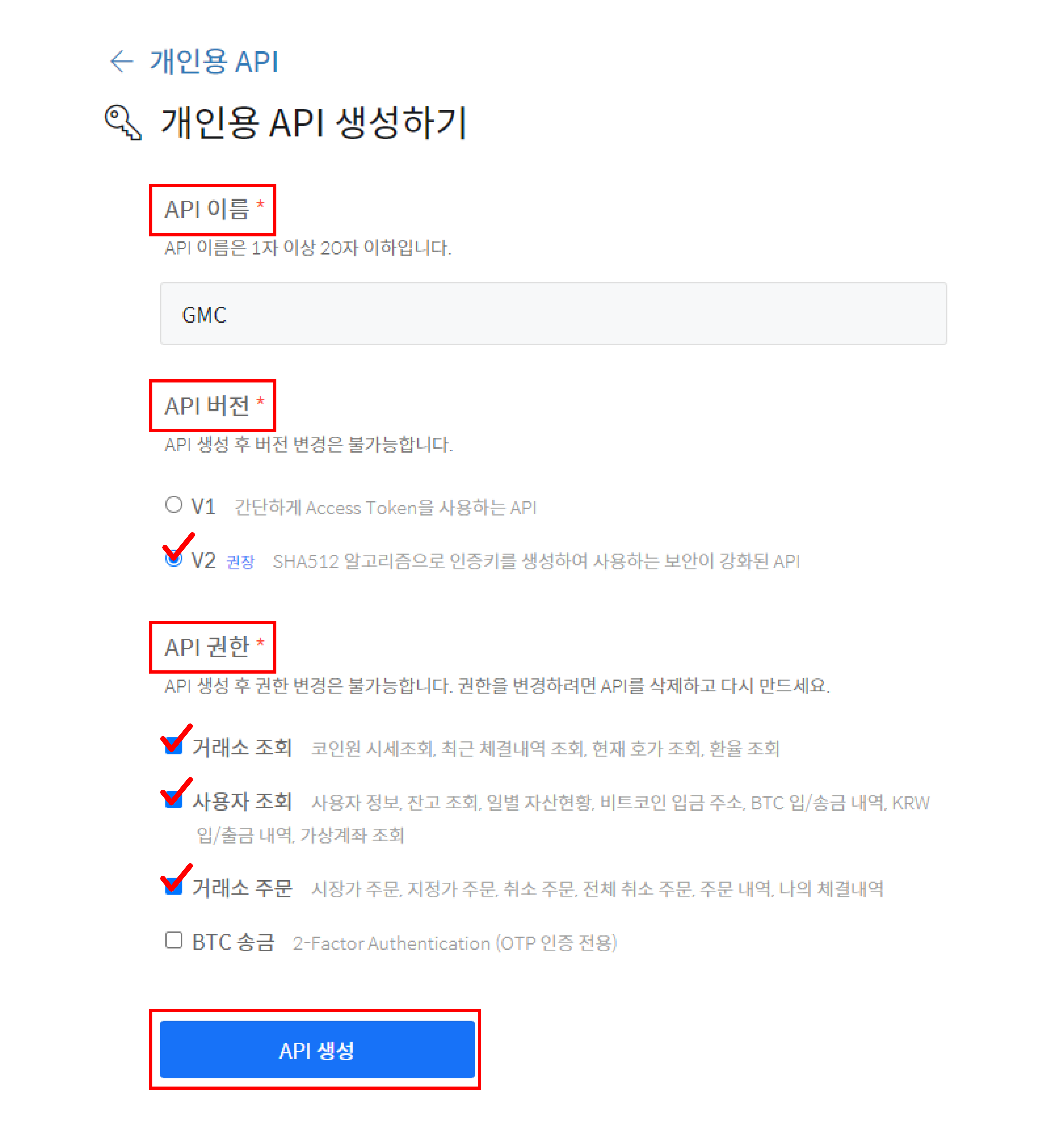 4. API 이름을 작성하시고, API 버전-V2으로 설정하시고, API 권한은 거래소 조회, 사용자 조회, 거래소 주문 총 3가지를 선택하시고 API 생성 버튼을 클릭합니다.