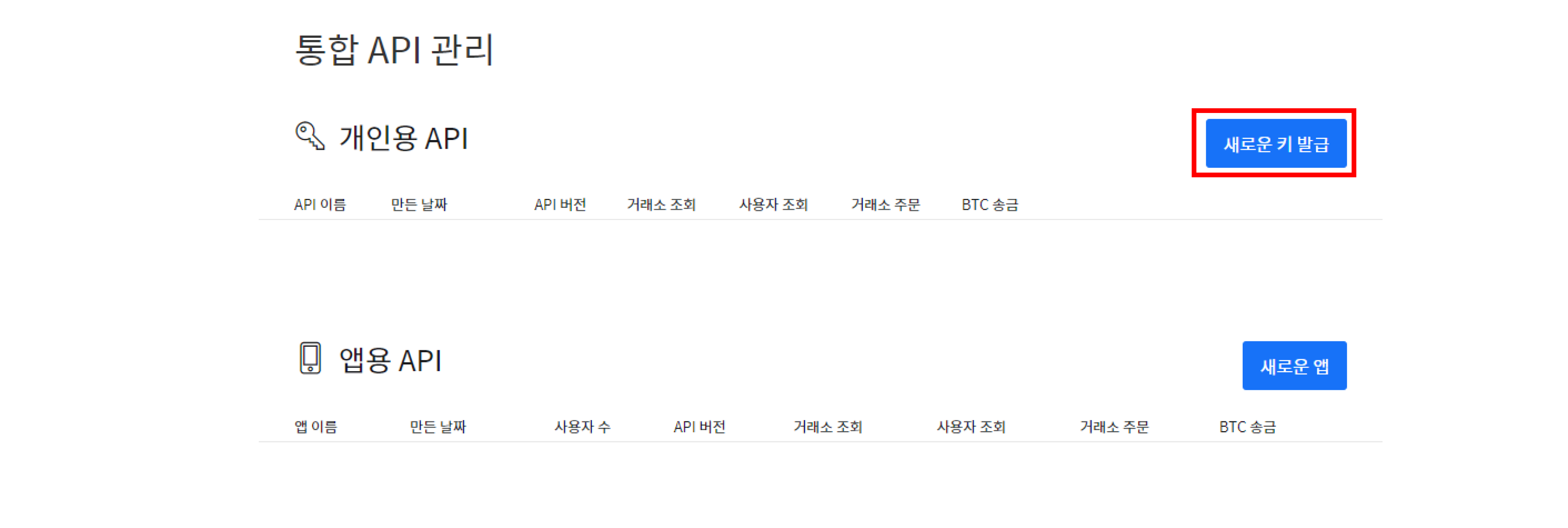3. 통합 API 관리에서 개인용 API의 ■'새로운 키 발급'을 클릭합니다.