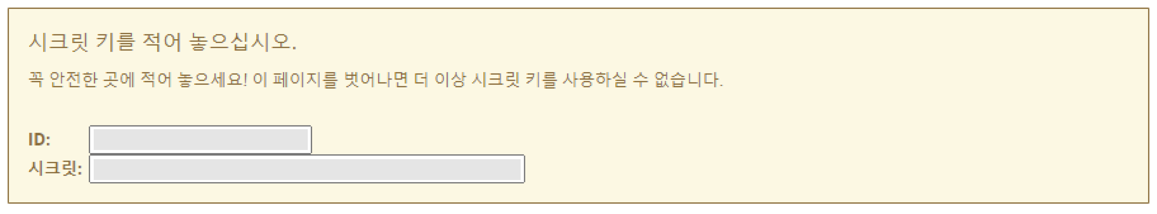 4. 하단에 ID와 시크릿(Secret Key)이 생성됩니다. 내용을 복사한 후 꼭 메모장에 저장해 주세요.