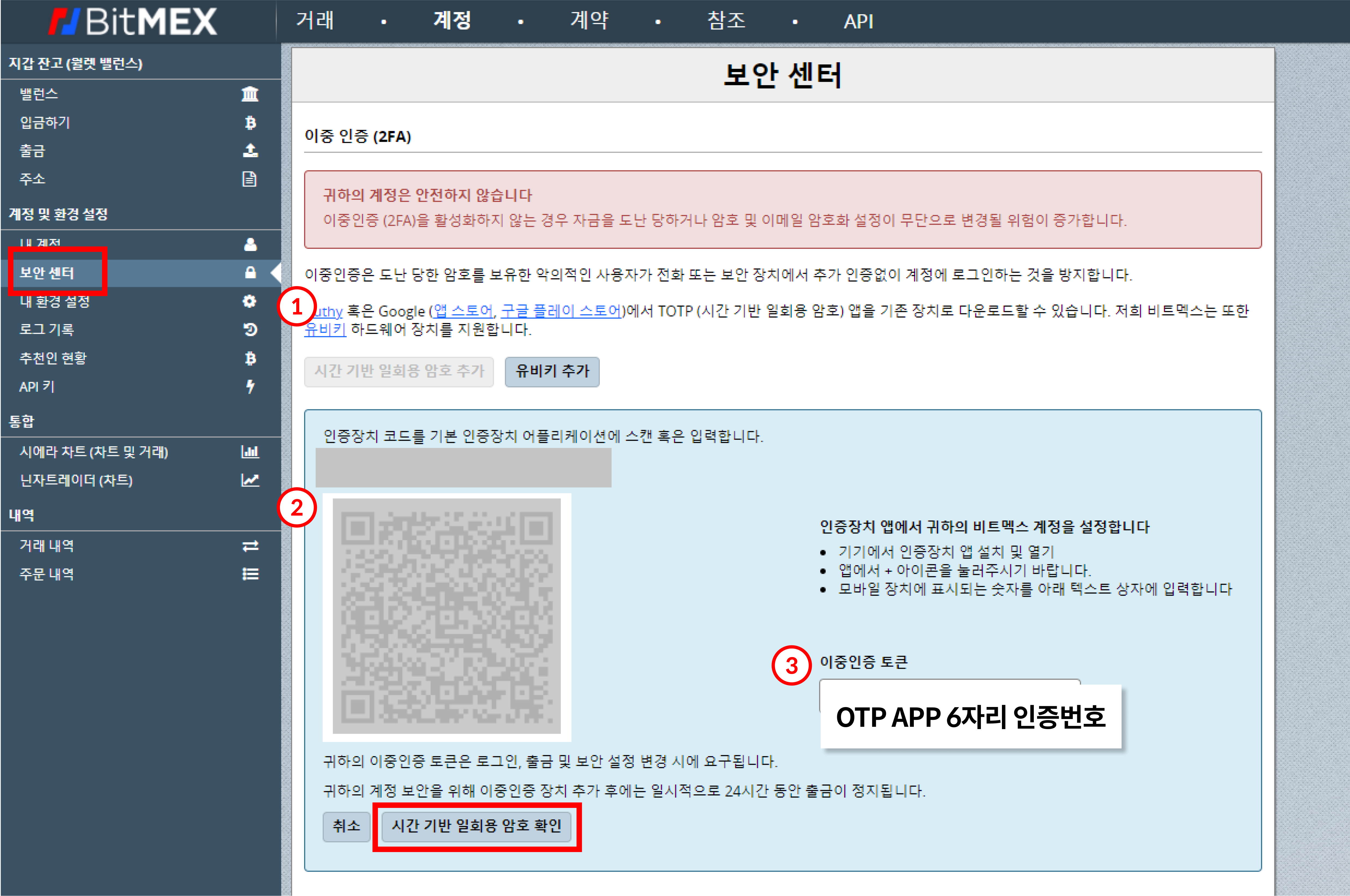 ③[Google OTP 앱 - BitMEX]에 나와있는 번호 6자리를 입력하고 ■시간 기반 일회용 암호 확인 버튼을 클릭합니다.