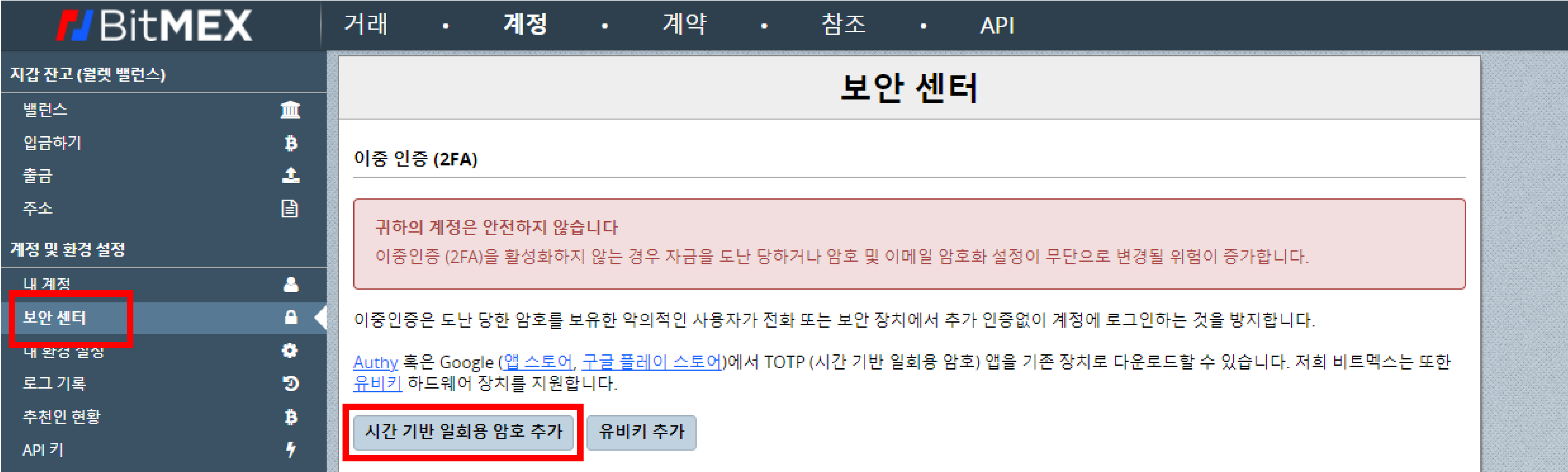 3. 보안센터에서 ■시간 기반 일회용 암호 추가를 클릭합니다.
